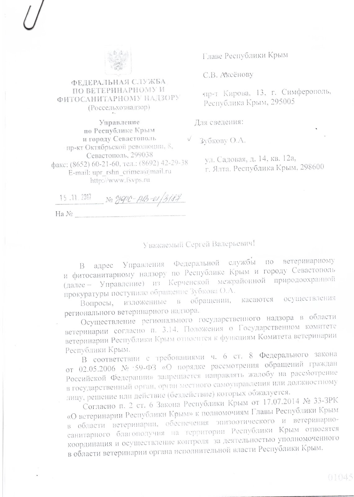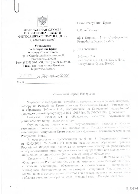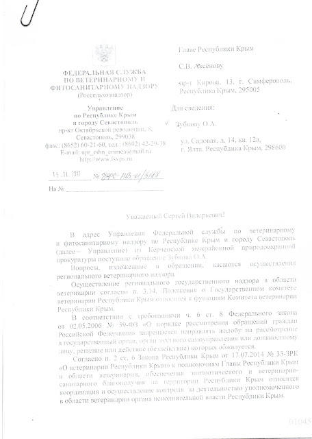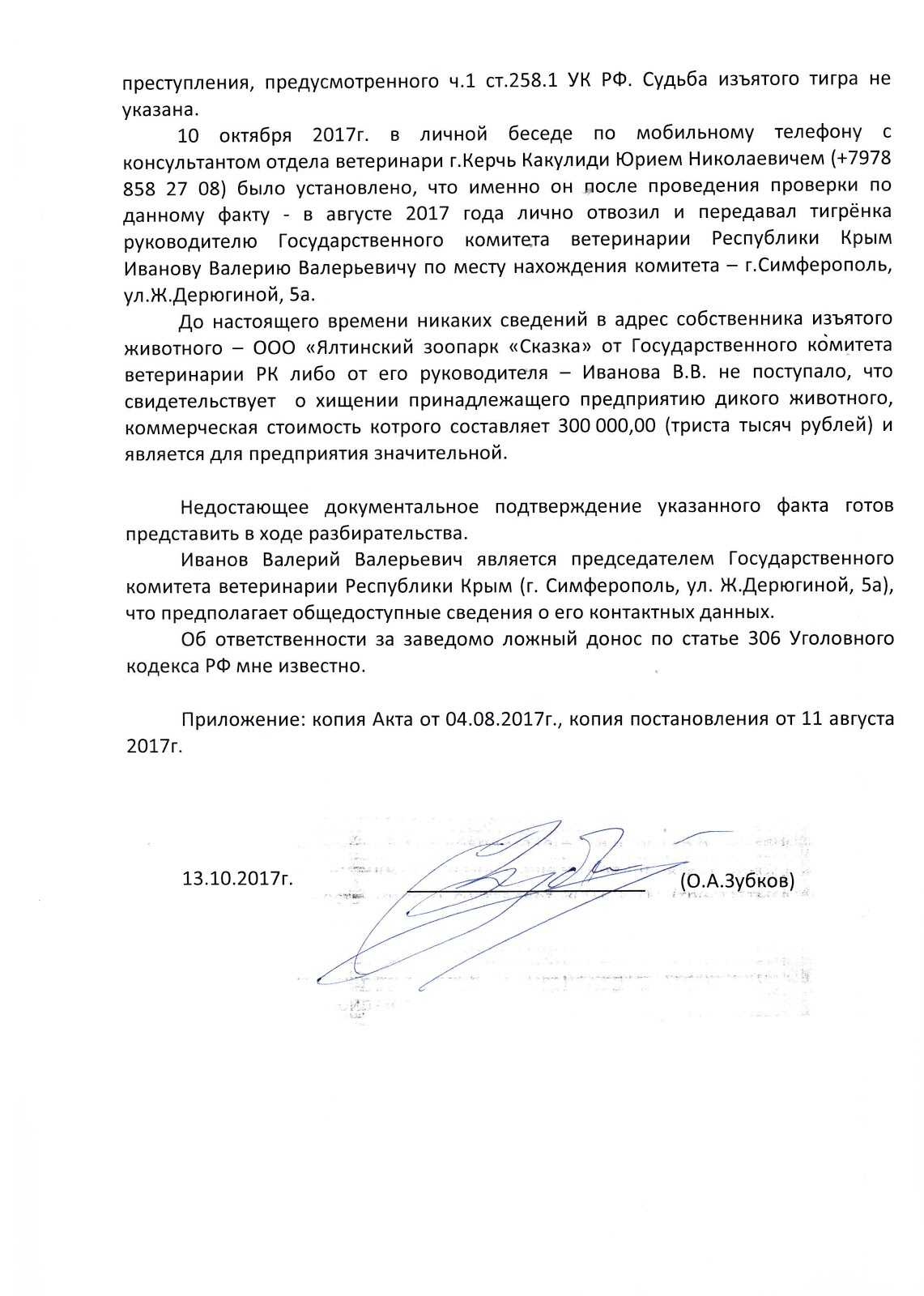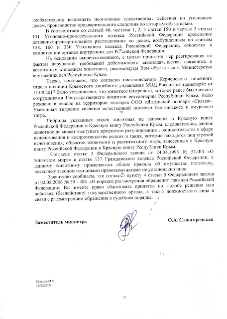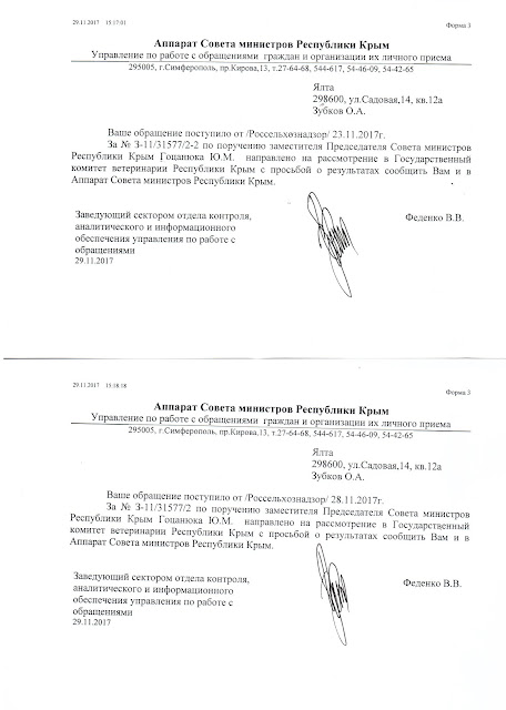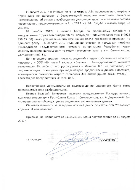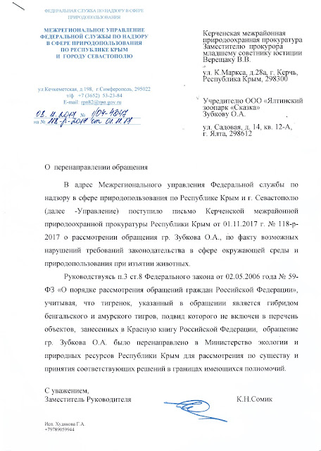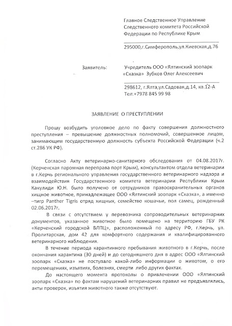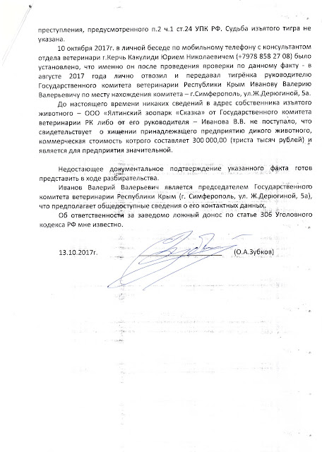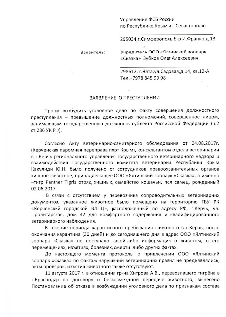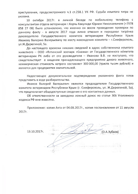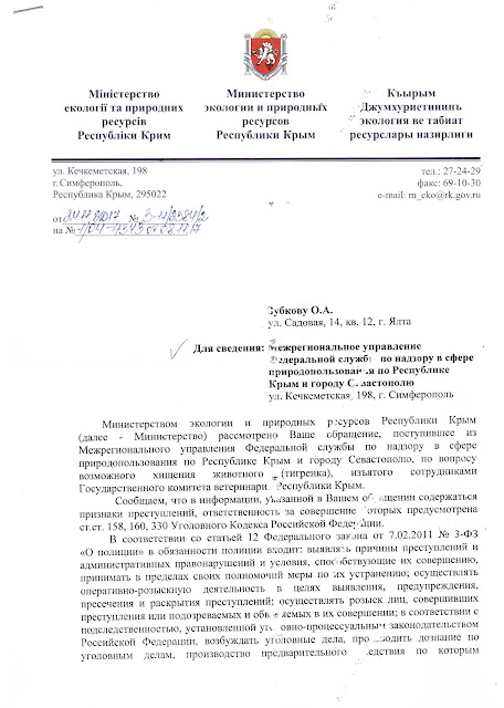 В линейном отделе г. Керчи, быстро разобрались кто собственник тигрёнка, убедились в законности происхождения тигрёнка и административное дело прекратили в связи с отсутствием состава преступления, о чём нам даже дали соответствующее постановление. Также нас предупредили о том, что по закону ветеринары имеют право задержать тигрёнка на срок до 30 и более суток для проведения карантинных мероприятий, после чего обязаны вернуть животное собственнику. Возможно в России везде это именно так и происходит, но только не в Крыму, где ветдепартамент возглавляет ранее судимый доктор Иванов. Прождав положенные по закону 30 дней, мы стали волноваться за судьбу тигрёнка. Нас, как собственников, так и не известили где он и что с ним. Мы стали распутывать цепочку передачи тигрёнка и установили что след теряется в Симферополе. Зная что чиновничий Симферополь нам не победить, мы стали обращаться в октябре в разные правоохранительные органы. Вот наши обращения: