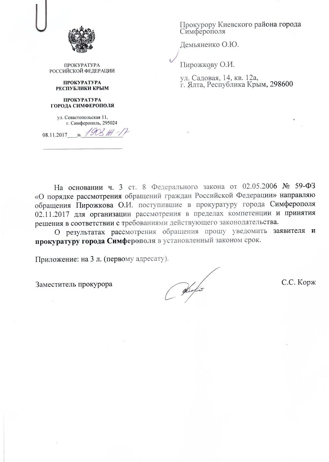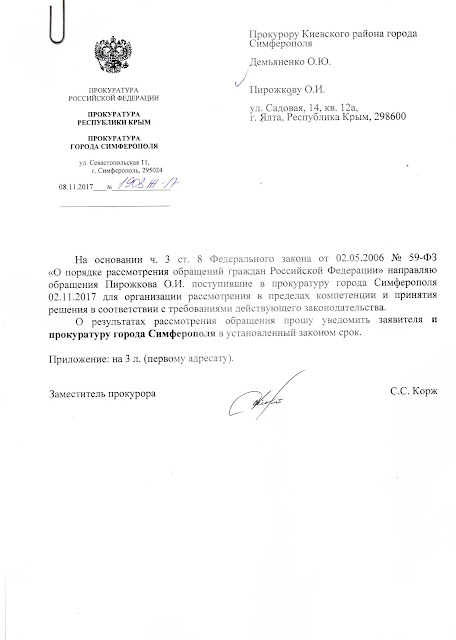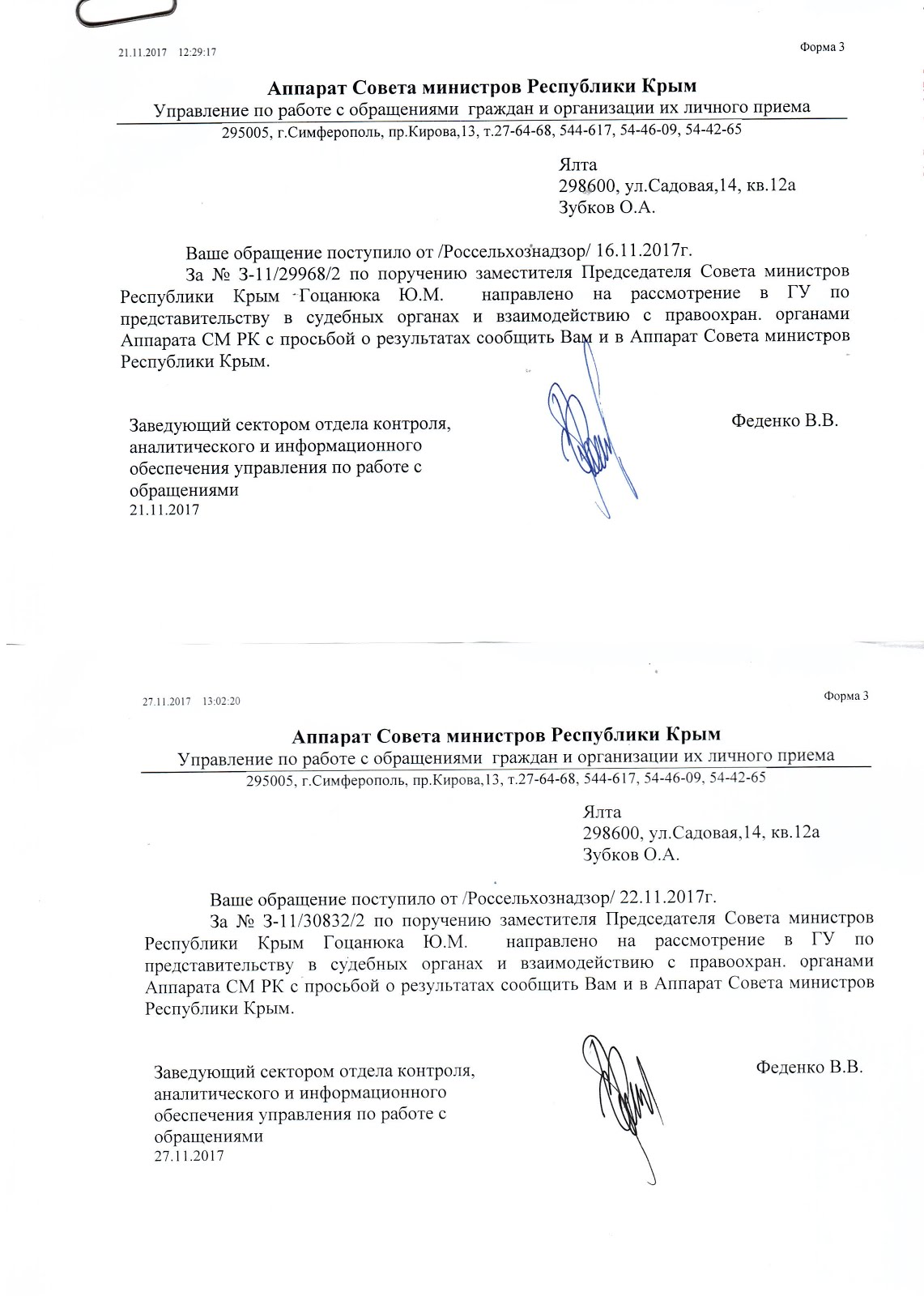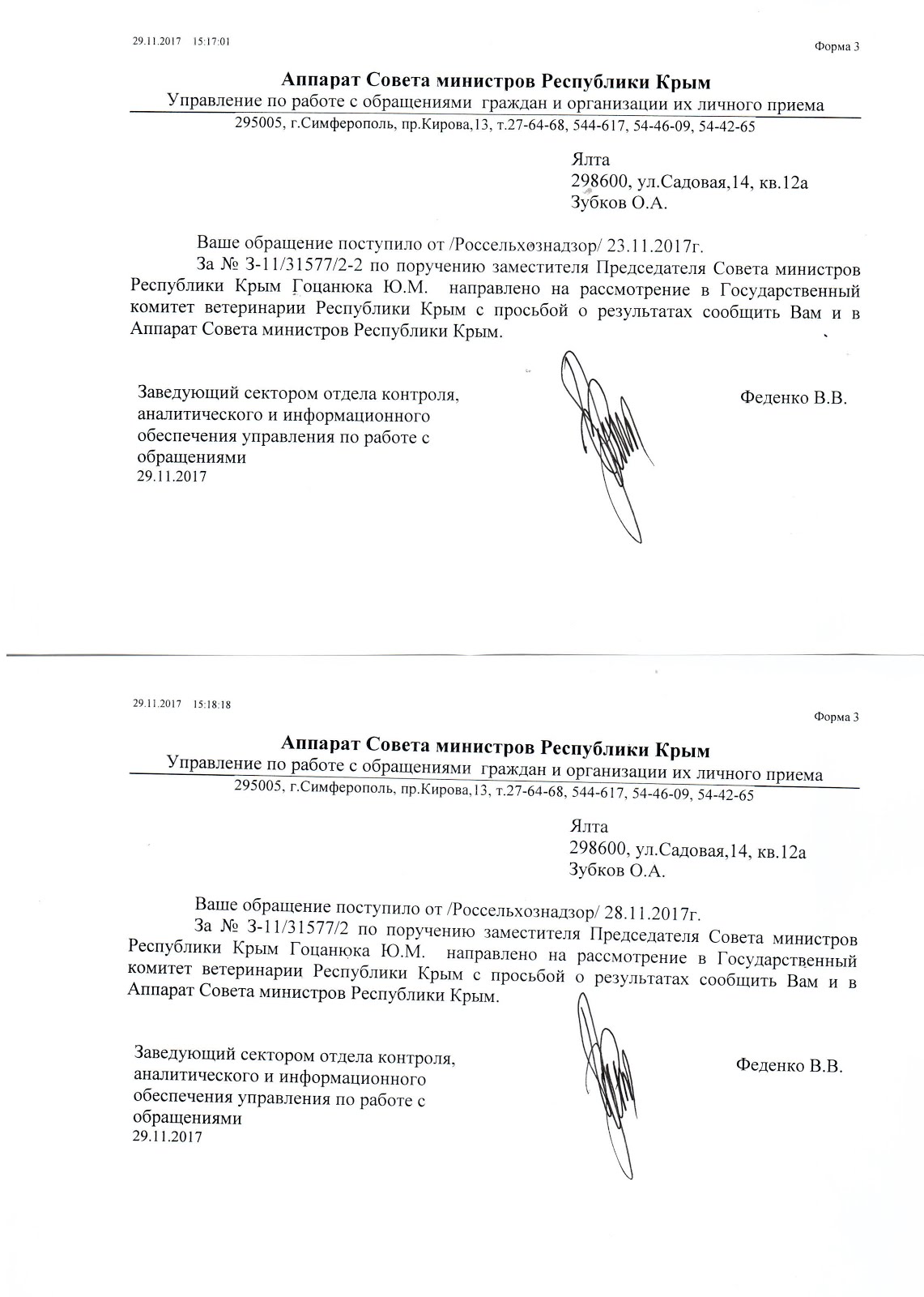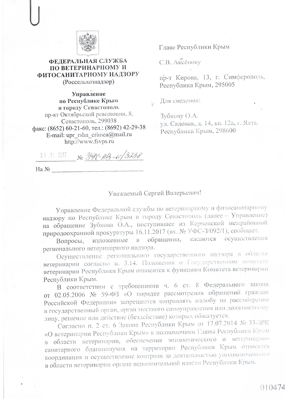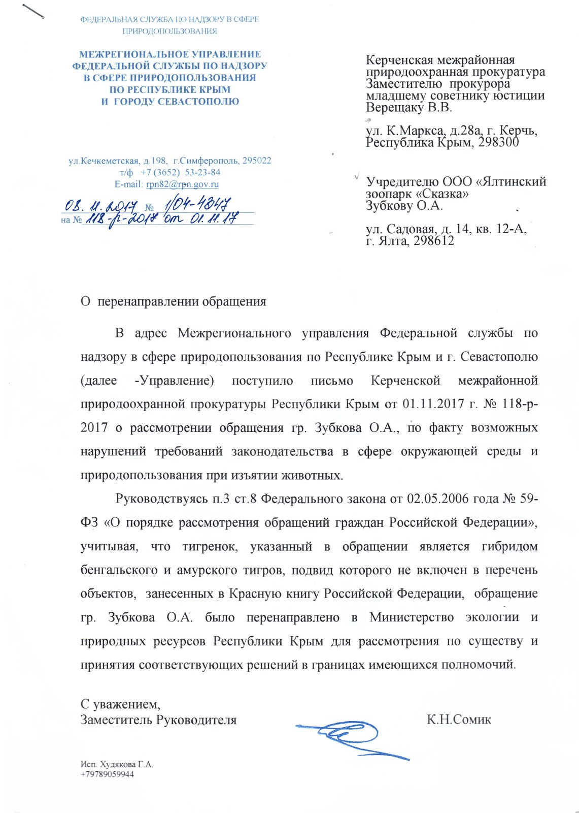 В линейном отделе г. Керчи, быстро разобрались кто собственник тигрёнка, убедились в законности происхождения тигрёнка и административное дело прекратили в связи с отсутствием состава преступления, о чём нам даже дали соответствующее постановление. Также нас предупредили о том, что по закону ветеринары имеют право задержать тигрёнка на срок до 30 и более суток для проведения карантинных мероприятий, после чего обязаны вернуть животное собственнику. Возможно в России везде это именно так и происходит, но только не в Крыму, где ветдепартамент возглавляет ранее судимый доктор Иванов. Прождав положенные по закону 30 дней, мы стали волноваться за судьбу тигрёнка. Нас, как собственников, так и не известили где он и что с ним. Мы стали распутывать цепочку передачи тигрёнка и установили что след теряется в Симферополе. Зная что чиновничий Симферополь нам не победить, мы стали обращаться в октябре в разные правоохранительные органы. Вот наши обращения: