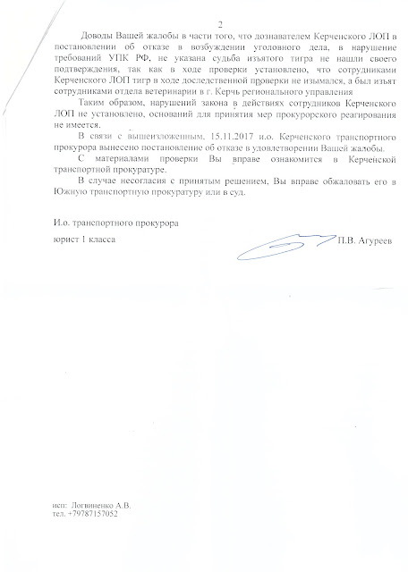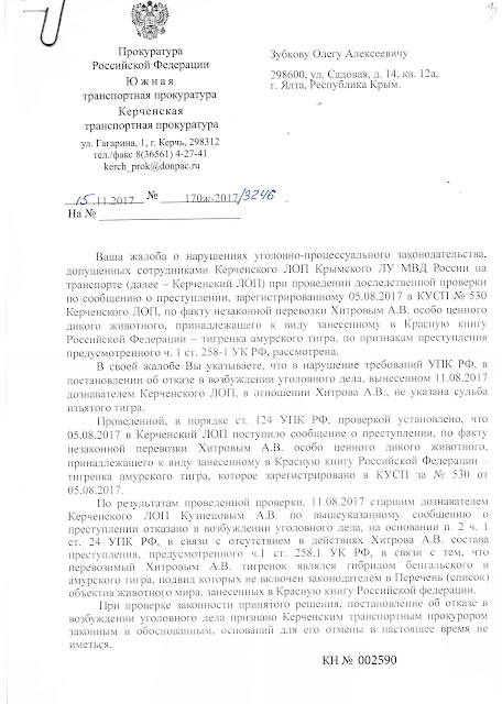 И тут начался настоящий цирк, вместо того чтобы установить и ответить на вопрос, что случилось с тигрёнком и где он находится в настоязее время, мы стали получать маразматические отписки. Да Вы сами почитайте. Что и как отвечают наши доблестные правоохранительные органы: