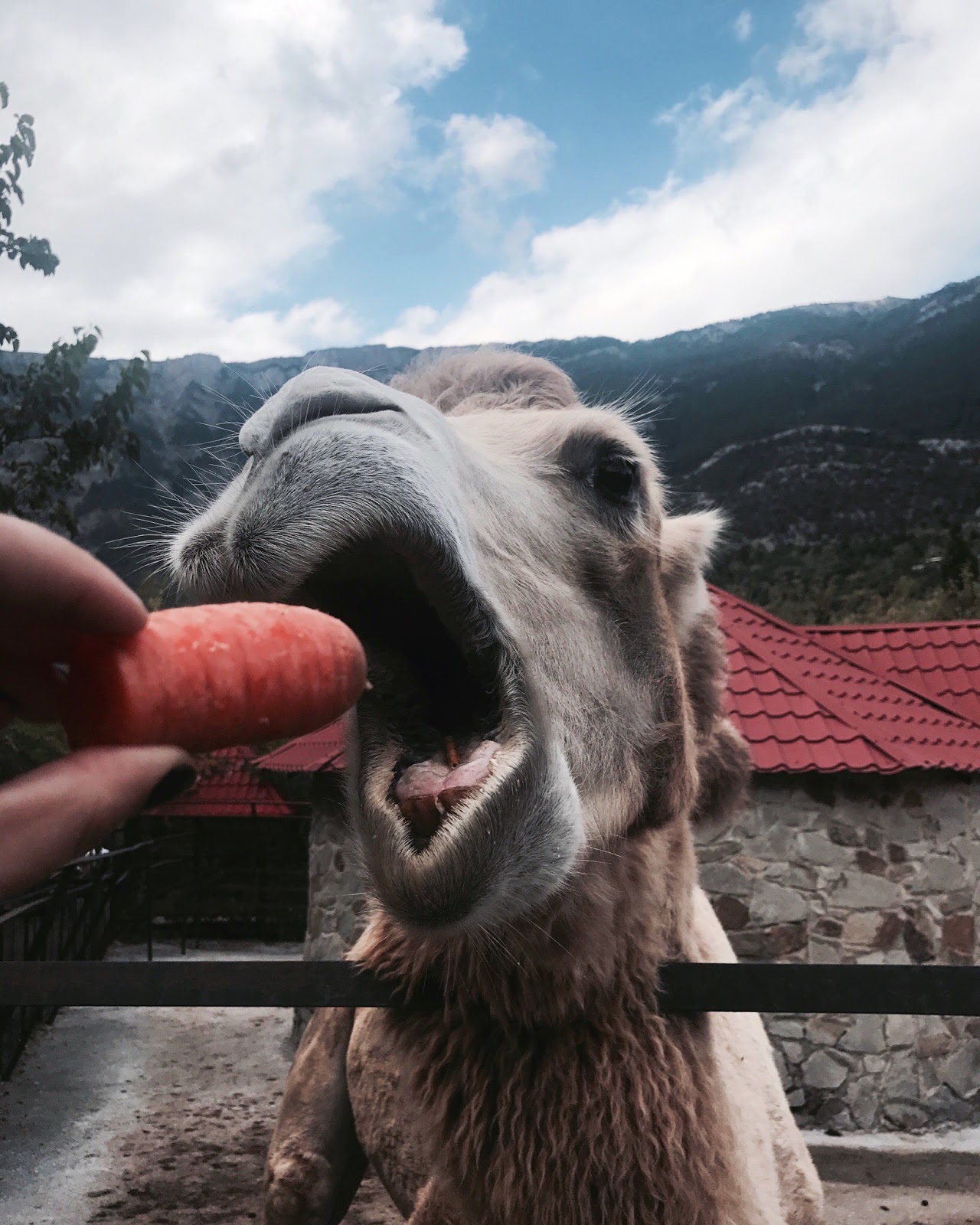 Всех копытных можно кормить и нужно кормить. Жираф предпочитает исключительно печенье, а верблюды и пони едят все подряд. Верблюды очень общительны и выпрашивают еду, облизывая руки.