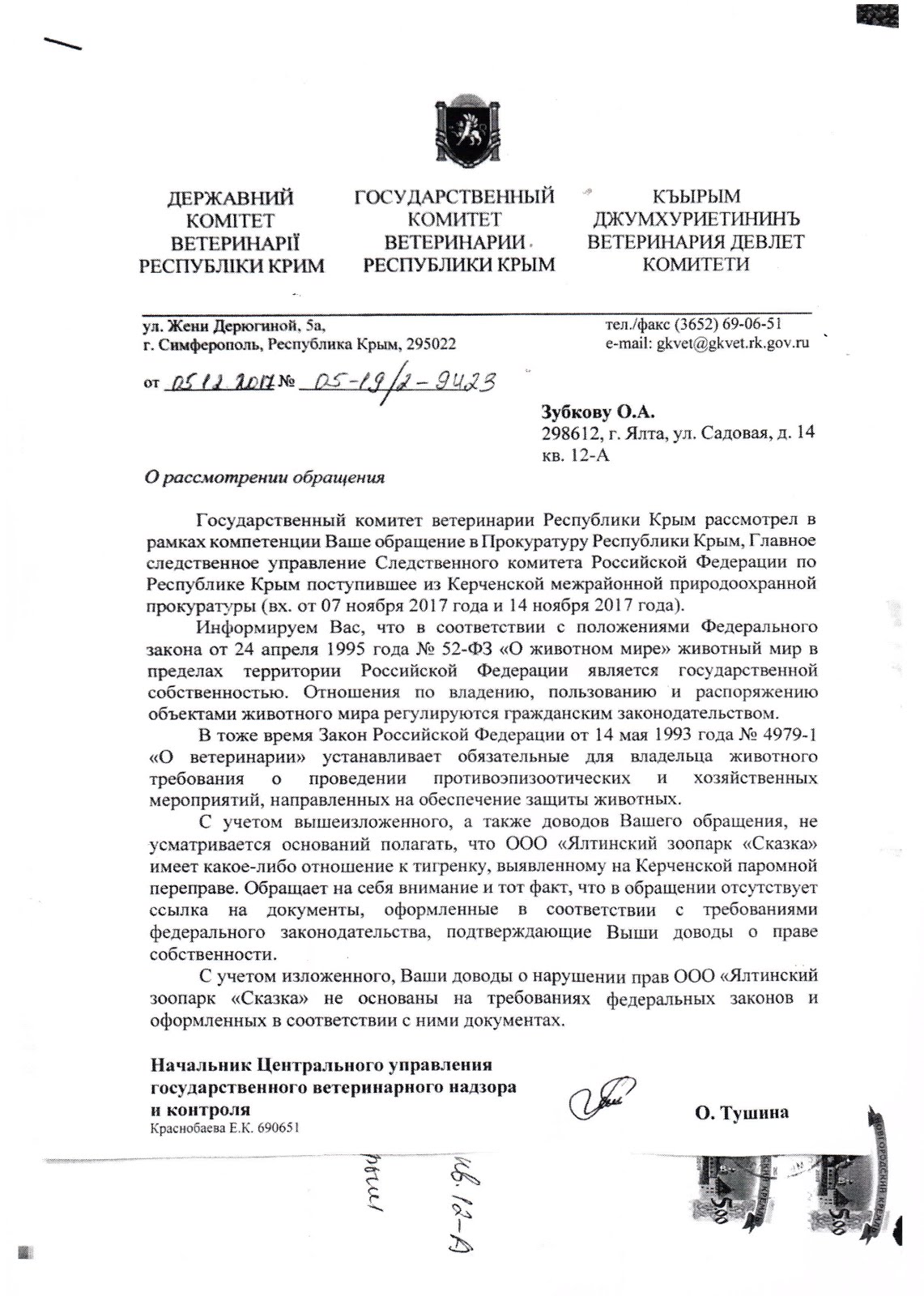 Также вчера на почте мы получили письмо из ветдепартамента Крыма, в котором сказано что все животные находящееся на территории Крыма являются государственной собственностью и что мы (Ялтинский зоопарк «Сказка» и парк львов «Тайган») никакого отношения к этому тигрёнку не имеем… Не верите?! Читайте сами, пожалуйста: